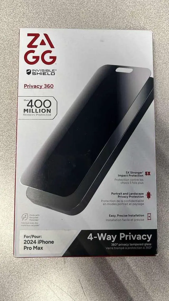 The ZAGG InvisibleShield Glass Privacy 360 Screen Protector for iPhone 16 Pro Max is a premium fullcoverage tempered glass privacy screen protector made for the Apple iPhone 16 Pro Max that uses ultrastrong aluminosilicate tempered glass engineered to be up to 5× stronger than traditional screen protection. It features a 360° fourway privacy filter that blocks onlookers from viewing your screen from above, below, or either side while still providing a clear, direct view, ClearPrint technology to help disperse fingerprints and reduce smudges, and an antimicrobial treatment to inhibit degradation by microorganisms. It also includes an EZ Apply installation tray with antidust adhesive for precise, bubblefree fitting and is made with up to 30 % postconsumer recycled glass and recyclable packaging, combining robust scratch resistance, privacy protection, and ecofriendly materials in one solution.