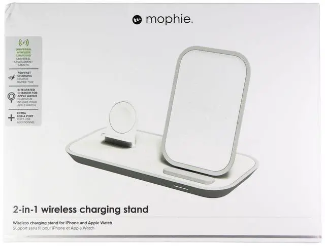Mophie 2-in-1 Wireless Charging Stand for iPhone & Apple Watch (All Series). White and Silver color design.