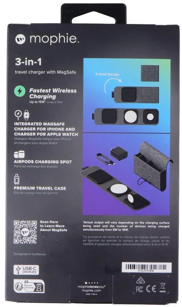Features:MAGSAFE COMPATIBILITY: MFi Certified with a magnetic array for a secure, efficient charging experience with MagSafe-enabled iPhones and other Apple devicesRAPID WIRELESS CHARGING: Experience up to 15W of fast charging, ensuring your device is powered up quickly and reliablyTRAVEL-FRIENDLY DESIGN: Compact and foldable, this charger fits into a sleek travel case, transforming any space into a convenient charging stationMULTI-DEVICE CHARGING: Simultaneously charge your iPhone, Apple Watch, and AirPods with designated, optimized charging spots for each deviceCOMPLETE CHARGING SOLUTION: Includes a magnetic Apple Watch charger, a specific spot for AirPods, a USB-C cable, and a 30W USB-C PD wall adapter