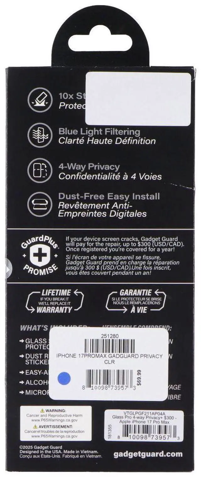 The Gadget Guard Glass Pro Privacy Screen Protector for Apple iPhone 17 Pro Max and iPhone 16 Pro Max Smartphones. Features:4-Way Privacy10x Stronger than GlassBlue Light FilteringDust Free Easy Install