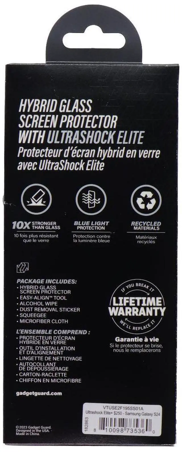 Features:Specifically designed to fit the Samsung Galaxy S24 for precise edge-to-edge coverageUltraShock Elite tempered glass provides advanced impact resistance to guard against drops and scratchesBuilt-in blue light filtering helps reduce digital eye strain during extended screen useMaintains crystal-clear display quality and ultra-responsive touch performanceEasy, bubble-free installation with included alignment tools for a perfect fitOleophobic coating repels fingerprints, smudges, and oils for a clean, polished screen finish