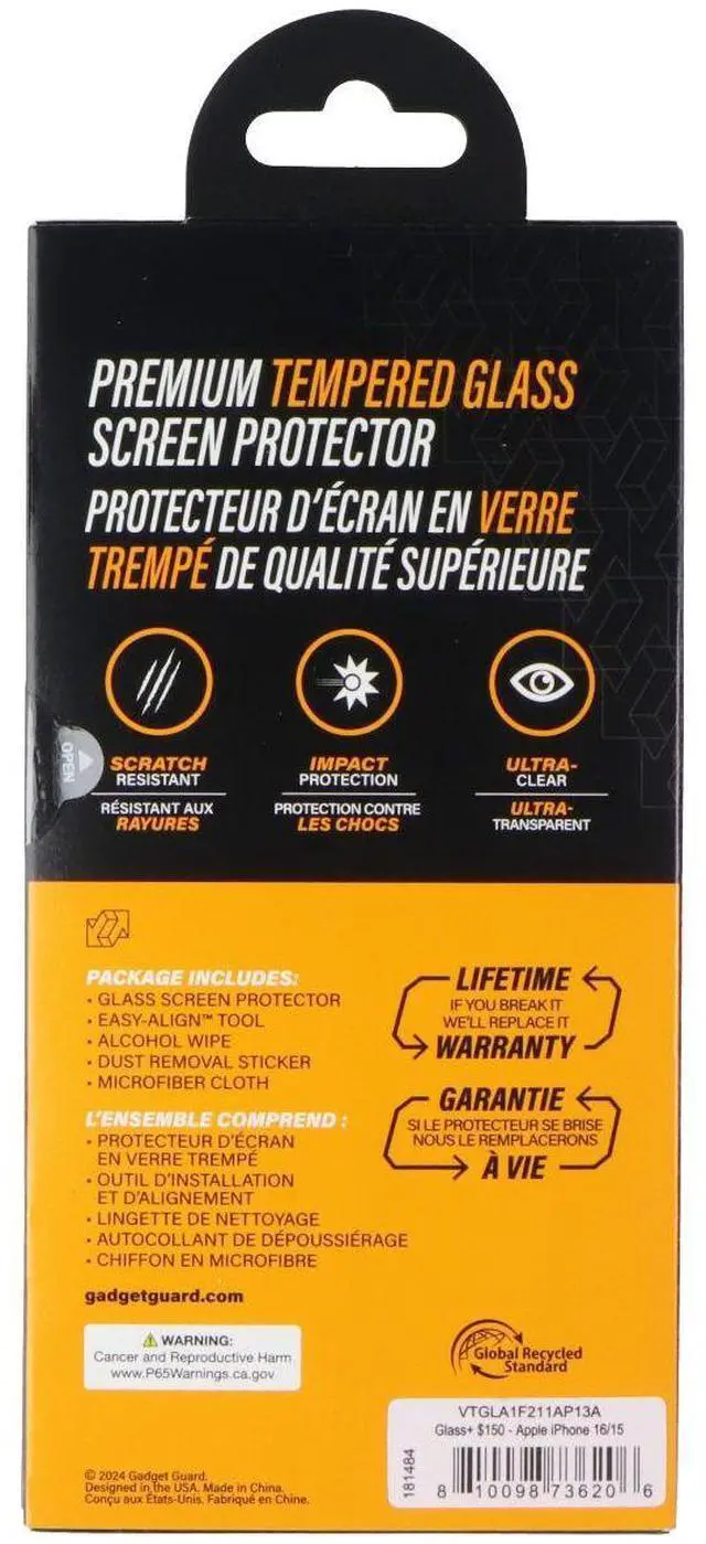 The Gadget Guard Glass Screen Protector for Apple iPhone 16 / 15 Smartphones.