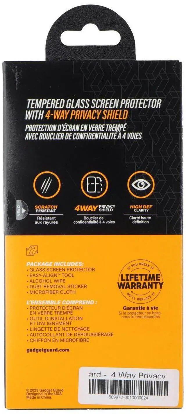 The Gadget Guard Glass with Privacy Screen Protector for Apple iPhone 15 Pro. Features:Scratch Resistant4 Way Privacy ShieldHigh Def ClarityEasy Application Tool