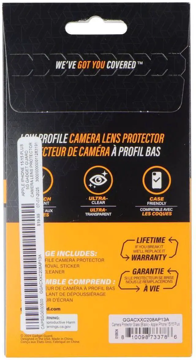 Gadget Guard Glass Camera Protector for Apple iPhone 15 and iPhone 15 Plus Smartphones. Black cap color.