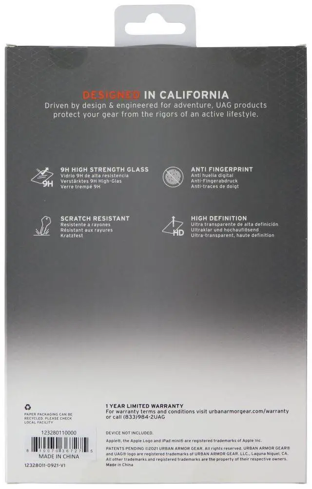 Features:Premium double-strengthened tempered glass protects your screen from scratches and abrasions even in the most demanding environments. Note: Older packaging does not state the compatibility for iPad mini A17 Pro (2024) . This case is designed to FIT iPad mini A17 Pro (2024) & iPad mini (6th Gen, 2021)Ultra-thin construction delivers precision touch sensitivity and ultra-clear pristine high definition surface clarity.Special coating that repels natural skin oil; limiting fingerprints and smudges.Precision Fit // Glass specifically designed for a perfect fit with UAG cases.Quickly and easily install at home with the included Applicator & cleaning kit.