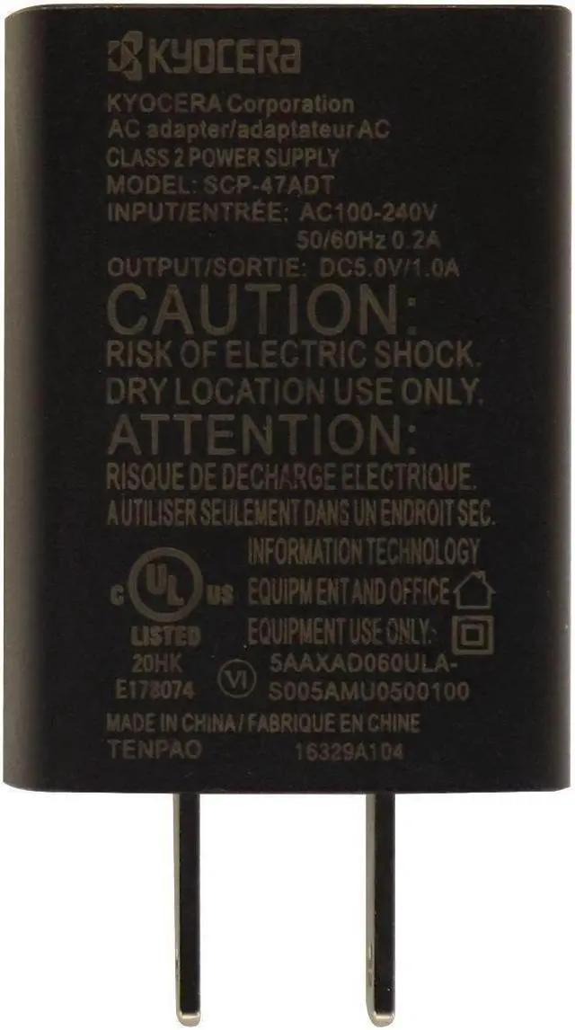 Kyocera products, 5V - 1A Universal Wall Charging Adapter. All black finish. Model: SCP-47ADT.