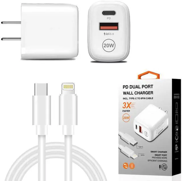 - 1x 20W wall charger plug, 1x 4ft 8 pinÃ¥Ãto type-cÃ¥Ãcable are included in the bundle.