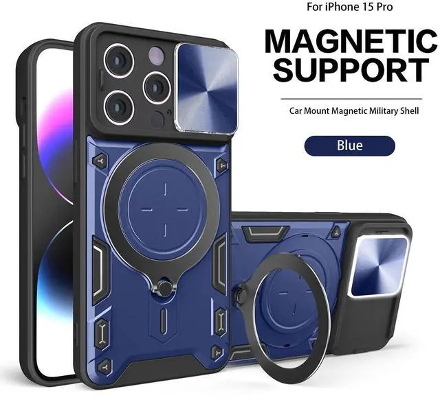 • TPU PC Shockproof Magnetic Phone Case with Free Adjustment Ring Holder for IPHONE 15 PRO in Blue