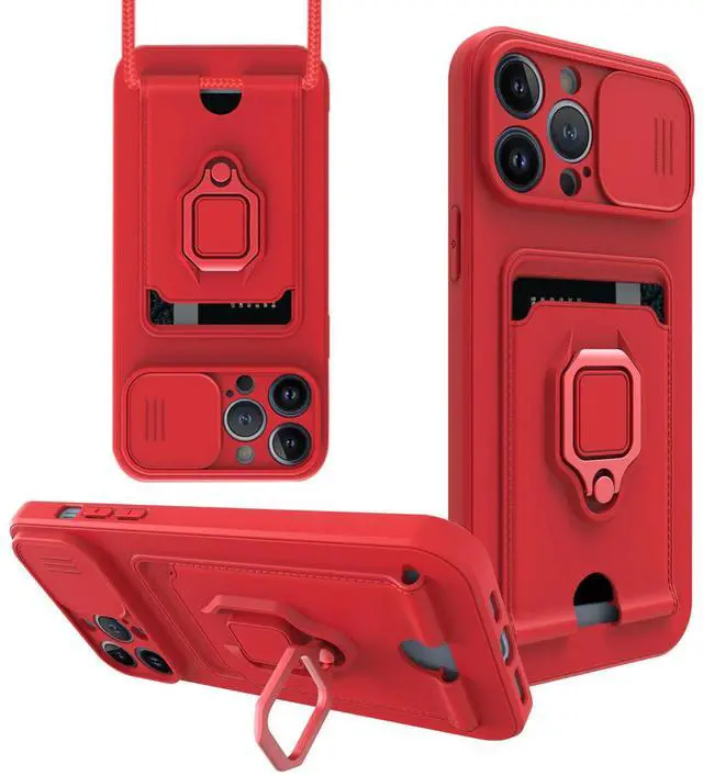 • High Quality iPhone 12 Max Case with Camera cover, Kickstand, Slide lens protection, Magnetic ring stand, Crossbody strap and Card holder In Red
