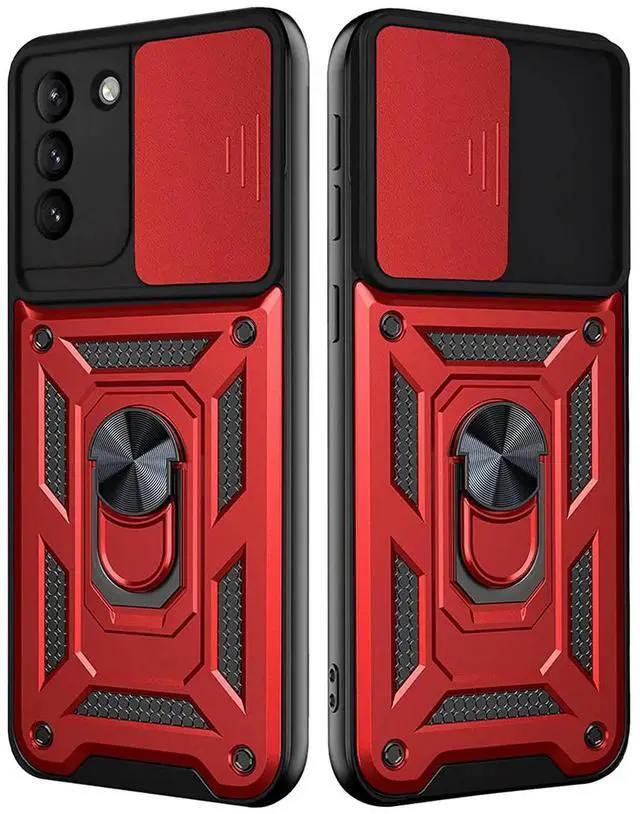 • Kickstand Ring Holder with Slide Camera Cover TPU Shockproof Case and Magnetic Car Mount for SAMSUNG GALAXY S21/S30 In Red