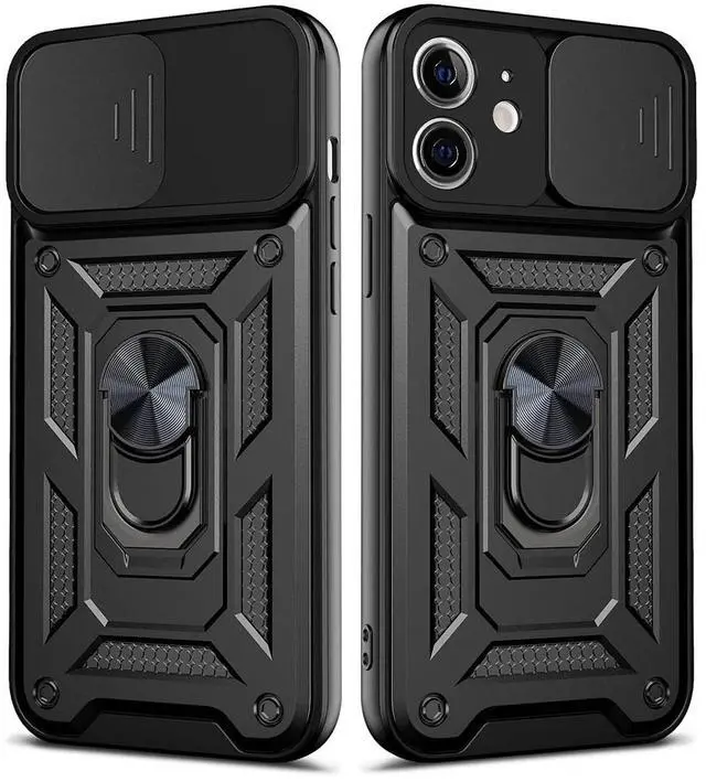 Kickstand Ring Holder with Slide Camera Cover TPU Shockproof Case and Magnetic Car Mount for APPLE IPHONE 12/IPHONE 12 PRO In Black