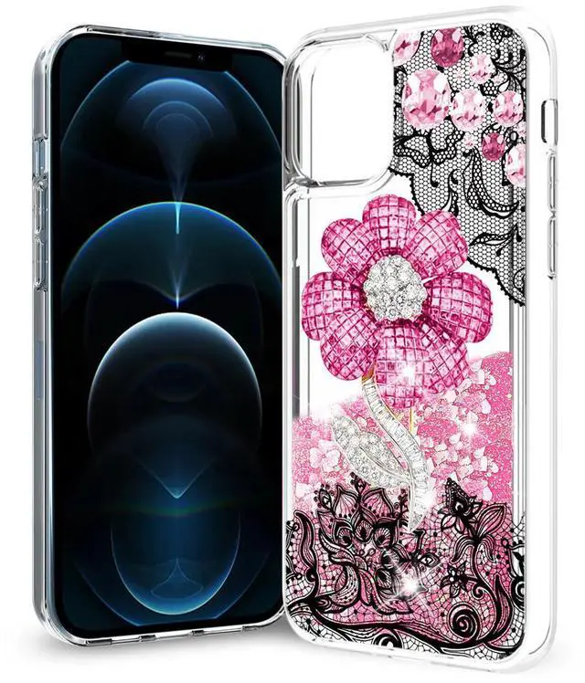 • Reiko iPhone 12 Pro Max Glitter Case Moving Quicksand Pink Floral