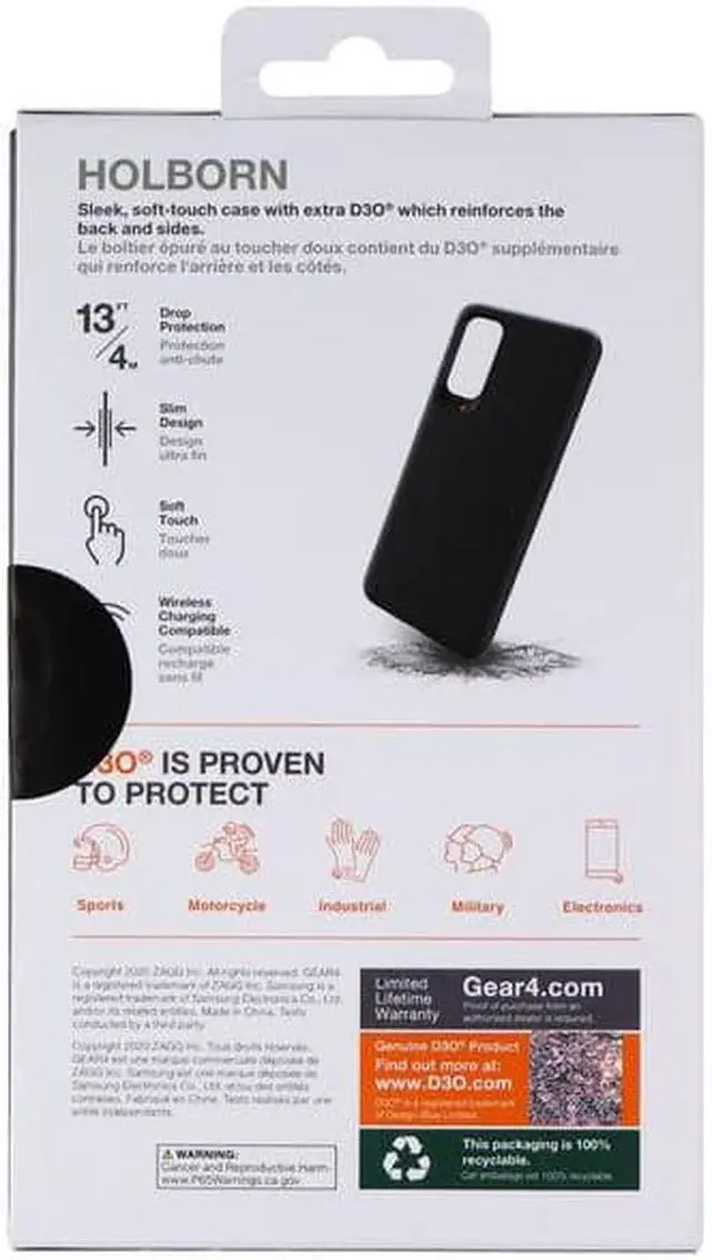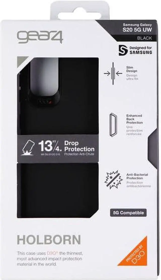 Gear4 Holborn Case for Galaxy S20 5G UW Black (840056127623) Shield your phone with the Holborn Case for Samsung Galaxy S20 5G UW. This slim case combines D30® shock absorbing material with an enhanced backplate to defend against impact damage. With up to 13 feet of drop protection your phone gets the protection it needs during your day to day life.