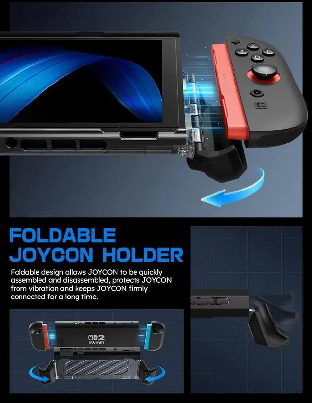 [Foldable Joy Cons Coverage]: Revolutionary hinge mechanism enables Joy Con controllers quickly assembled and disassembled, protects Joy Cons from vibration and keeps Joy Cons firmly connected for a long time.