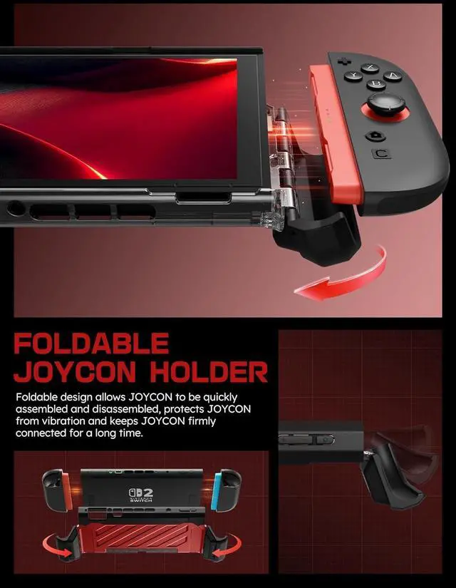 [Foldable Joy Cons Coverage]: Revolutionary hinge mechanism enables Joy Con controllers quickly assembled and disassembled, protects Joy Cons from vibration and keeps Joy Cons firmly connected for a long time.
