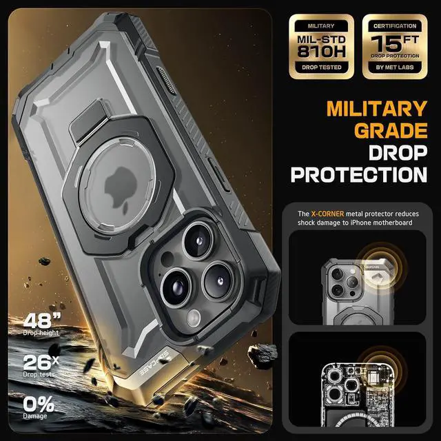 15FT drop protection, featuring four-corner airbag technology for shock absorption adhering to rigorous US military-grade standards.