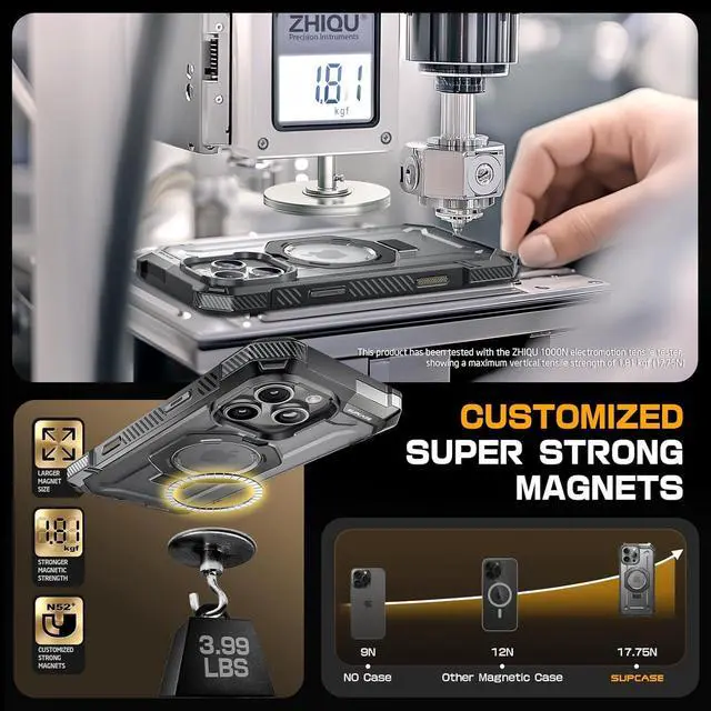 Built-in aluminum alloy kickstand offers multiple viewing angles. Equipped with an N52 powerful magnet, delivering a magnetic force of up to 1500g ensuring seamless compatibility with MagSafe accessories (magnetic car mount, MagSafe wireless charger, magnetic card holder, desktop magnetic wireless charging stand).
