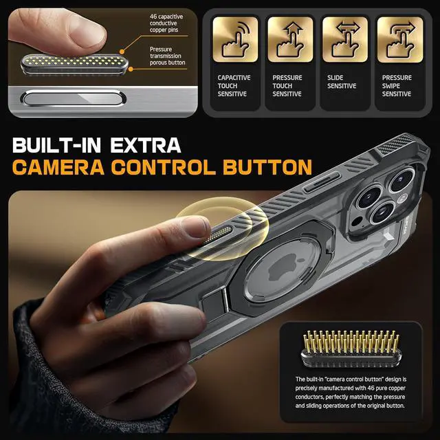 Built-in camera control capture button, seamlessly integrated with iPhone's button functions.
