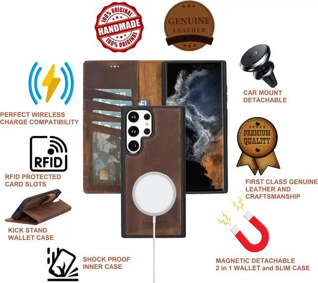 WIRELESS CHARGE COMPATIBLE PREMIUM GENUINE LEATHER and SHOCK ABSORPTION. Galaxy S23 Ultra 6.8" leather cases are precision made of top layer genuine cowhide leather. These hides are selected for quality, strength, character and grain. They look stylish and feel nature and soft. The inner shockproof cushions hug every corner ensuring the phone against drops and bumps. The raised edge around camera help protect the glass from any scratching and dirt