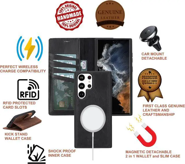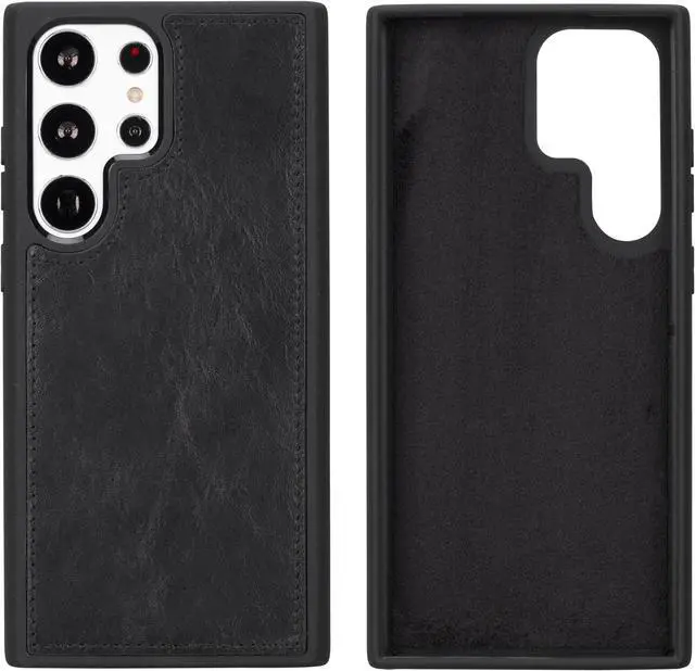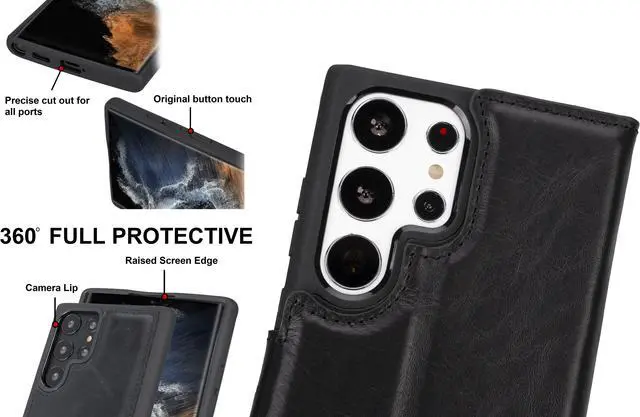 WIRELESS CHARGE COMPATIBLE PREMIUM GENUINE LEATHER and SHOCK ABSORPTION. Galaxy S23 Ultra 6.8" leather cases are precision made of top layer genuine cowhide leather. These hides are selected for quality, strength, character and grain. They look stylish and feel nature and soft. The inner shockproof cushions hug every corner ensuring the phone against drops and bumps. The raised edge around camera help protect the glass from any scratching and dirt