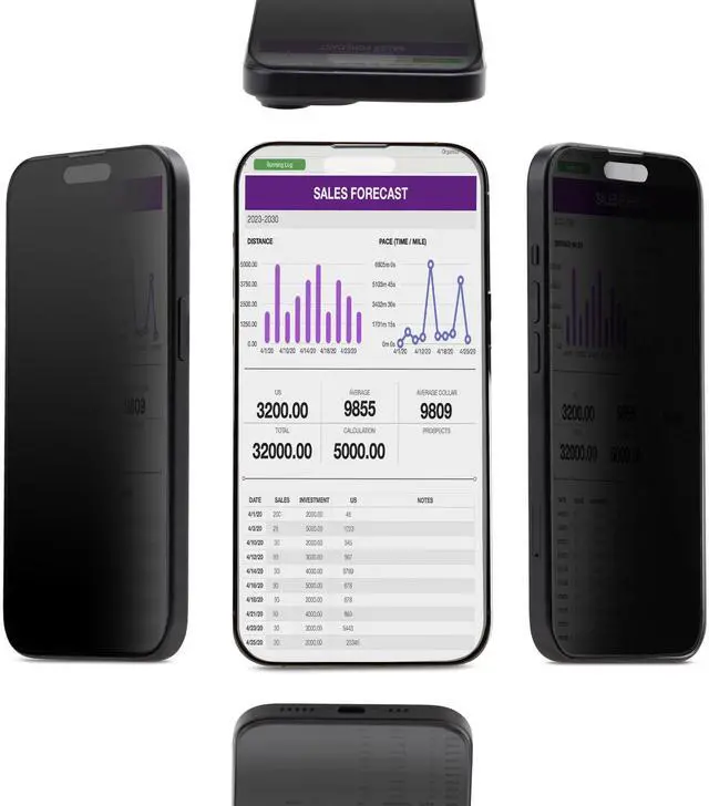 The security filter ensures optimal privacy in portrait or landscape orientations when viewed beyond 30° from the center, covering a total visible area of 60°. It supports touchscreen input and gestures, preserving the interactive experience of an iPhone while maintaining the confidentiality of on-screen content.