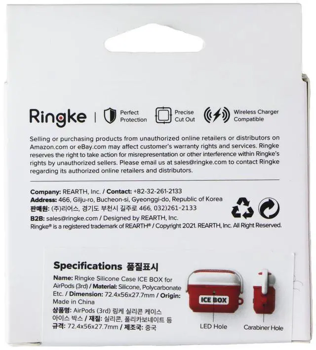 Features:Ringke Original Design! Classic icebox cooler inspired case for the AirPods Generation 3 (2021).Made from high-quality silicone for long-lasting durability and easy-to-hold soft feel.Polycarbonate handle-piece holds the top in place to prevent loss of earbuds.Protect your device against scratches, bumps, and impact.Wireless charger compatible. Attach the included carabiner for added convenience.