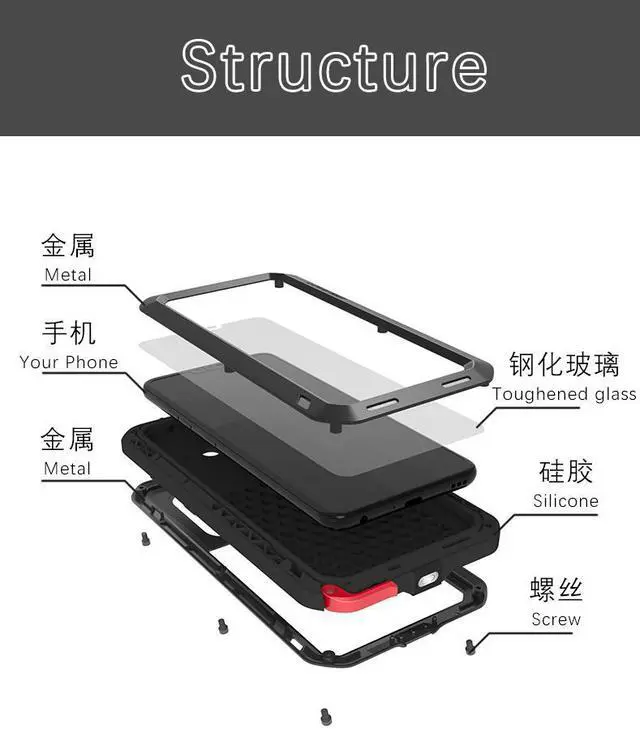 Material: Aluminum Frame + Silicon Back Cover + Gorilla Glass 2.100 % Brand New 3. Provide the highest level of overall protection for your phone (Dirtproof/ Dust /Shock proof) 4. Gorilla glass touchscreen, while opening the touchscreen to direct touch & perfect to protect your screen from damage 5. It also works seamlessly with every features and function: camera, flash, buttons, microphones and speaker 6. Do not worry signal lose, also can provide normal signal 7. Easy tonstallation and remove, and our parcel with installation tools for every phone case 8. Better Protection for pepole who engages outdoor jobs and buildings