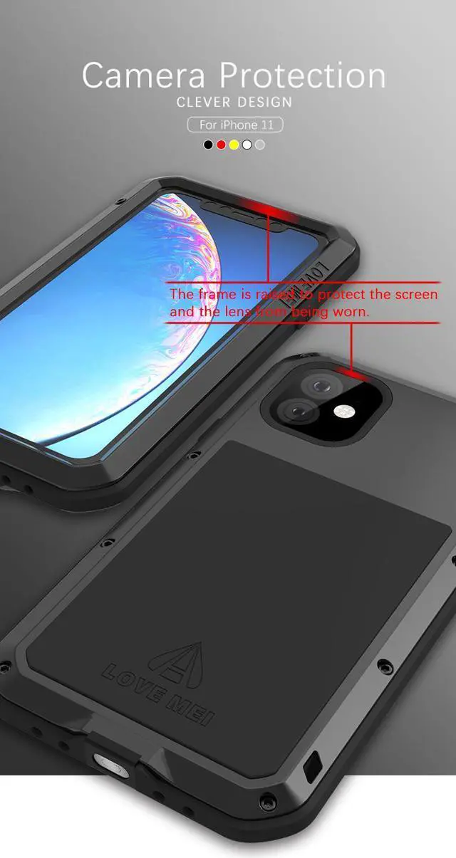 Love Mei Aluminum Metal Armor For iPhone 11 Shockproof Dirtproof Full Body Heavy Duty Case For iPhone 11 (Yellow) * Function: Shockproof,Dustproof,Anti Scratch. * Feature: Brand Waterproof Shockproof Aluminum Case Cover. * Material:Aluminum Metal Alloy+Silicon Gel. Note: you can use it when you live in Rainy day, snow day,but you cann't use it under water , that's means it cann't take photo / calling / video ect under the water .so please considering more before buy.thanks!!!