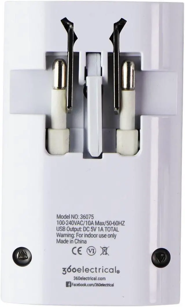 360 Electrical Universal 2 Outlet Adapter with 1A USB Port, White unit color.