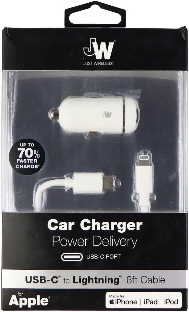 Recharge phones on the road with this Just Wireless Lightning car charger. Up to 3 amps of power delivery refills batteries quickly, while built-in overload protection guards against power surges and overcharging. This Just Wireless Lightning car charger includes a 6-foot USB-C to Lightning cable so passengers can recharge phones in the back seat.
