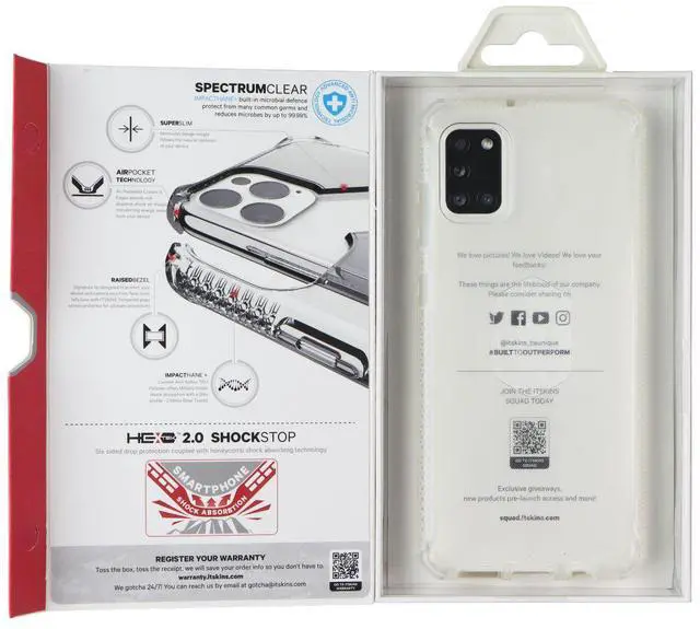 Features:Impacthane custom polymer fabricated with HEXOTEK 2.0 air pocket technologySuper performant with military-grade drop protectionSpectrumclear powerfully safeguards your phone with intelligent Drop Safe ProtectionSlim and ProtectiveCompatible Model: For Samsung Galaxy A31