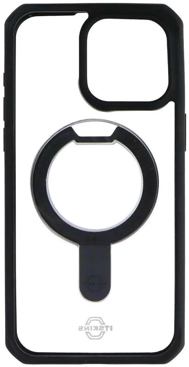 ITSKINS Hybrid_R // Stand Case for MagSafe for Apple iPhone 15 Pro Max. Black and Transparent (Clear) version.