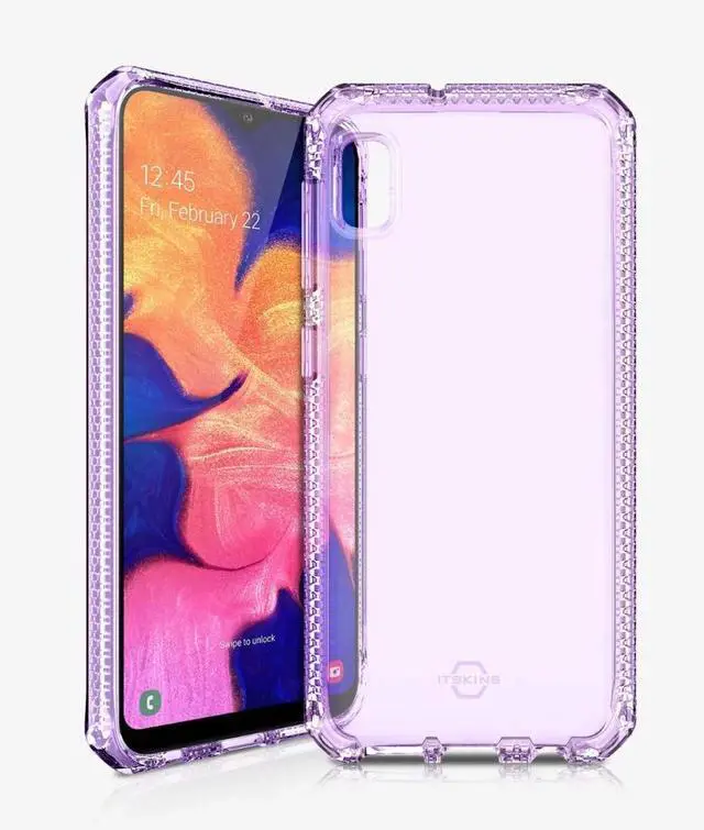 Protect your Galaxy A10e with the Itskins Spectrum Clear Protective Phone Case ? a slim, stylish light purple cover that combines military-grade shock resistance with anti-yellowing clarity for long-lasting looks and rugged daily protection.