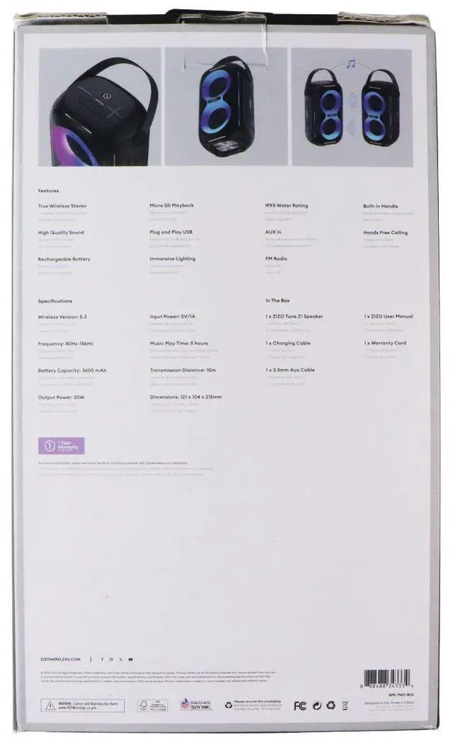 Features:True Wireless StereoHigh Quality SoundRechargeable BatteryMicro SD PlaybackPlug and Play USBImmersive LightingIPX5 Water RatingAUX InFM RadioBuilt-In HandleHands Free Calling