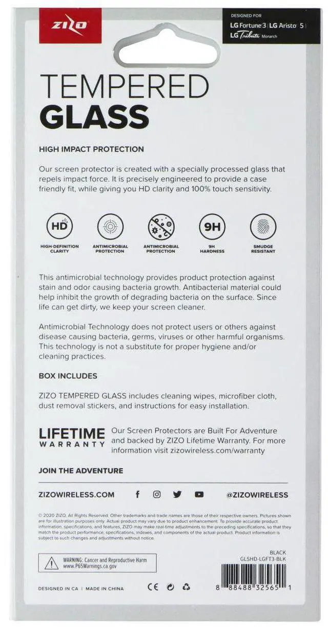 The Zizo Tempered Glass Screen Protector for LG Fortune 3/Aristo 5/Tribute Monarch Smartphones. Clear Version with Black Trim.