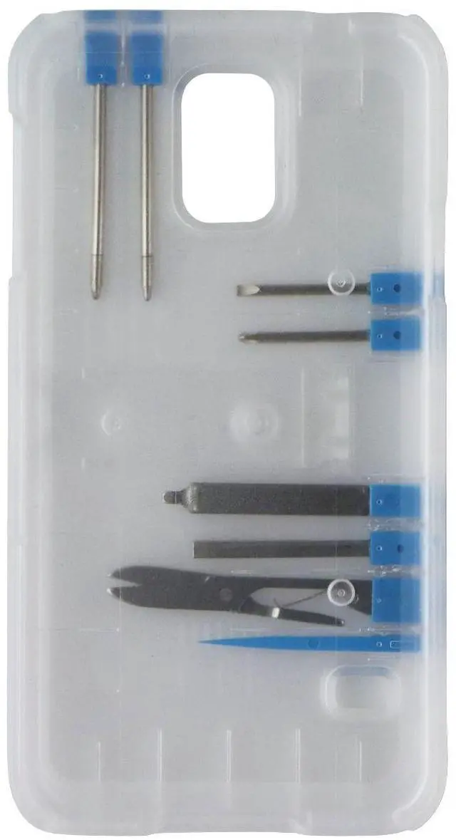 Features:Built-in set of 9 tools: blue ballpoint pen, red ballpoint pen, Phillips screwdriver, flat-head screwdriver, scissors, tweezers, nail file, toothpick, and a kickstand. TSA-compliant tools are approved for air travel. Case shell made of polycarbonate, giving it good durability and protection. Tool components made from marine-grade alloy stainless steel. Internal soft felt lining to prevent scratches on the back of the phone. Integrated kickstand to prop up the phone for media viewing.