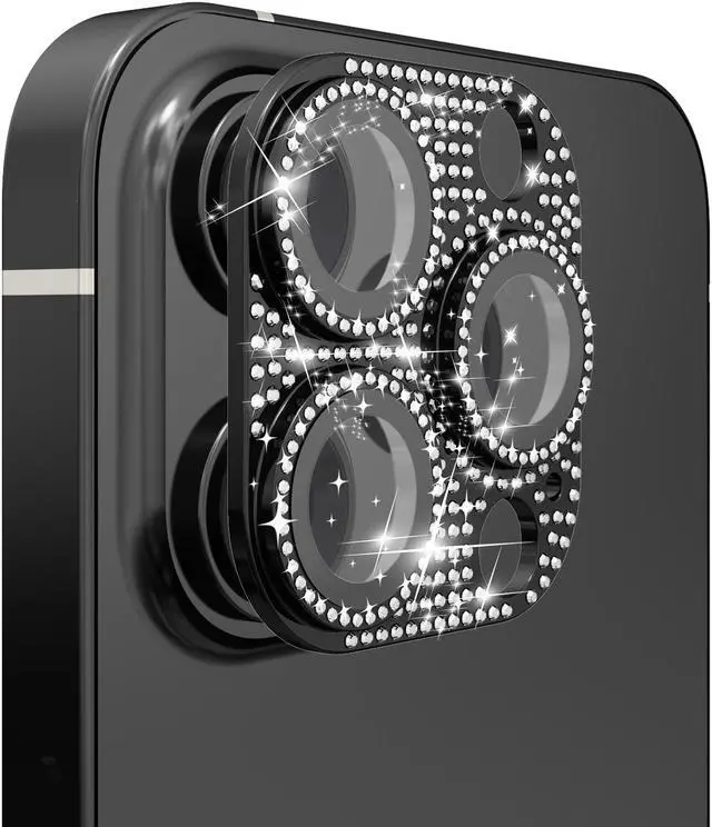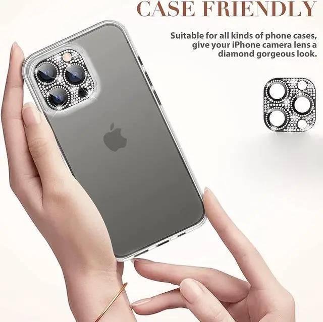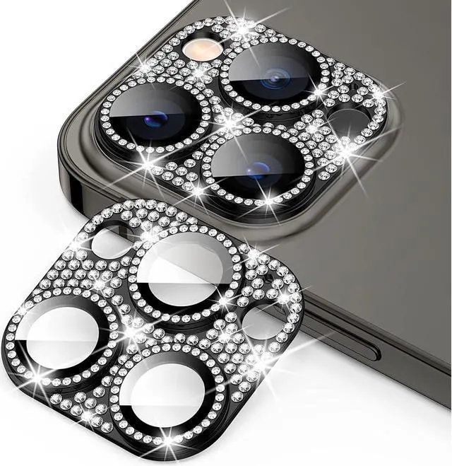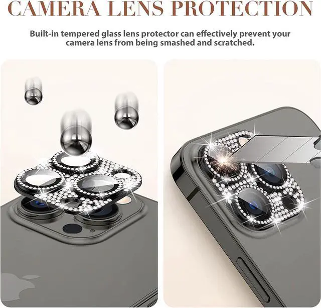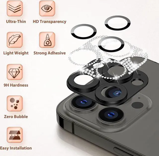 Features: Compatible with Apple iPhone 12 Pro. Shield your phone's rear camera lens with a full-coverage tempered glass protector. Take clean pictures and videos through super-clear glass with zero flash interference. Zinc alloy frame inlaid with reflective sparkly swarovski-grade rhinestones. Show off your style and individuality with rhinestone touch. The picture-perfect defense your state-of-the-art camera needs. Designed to fit flush with your lenses. Scratch proof surface with impact and shatter protection. The premium oleophobic coating keeps your lenses crystal-clean and free from oil, dirt, and fingerprints. Case-friendly design. Easy adhesive application.