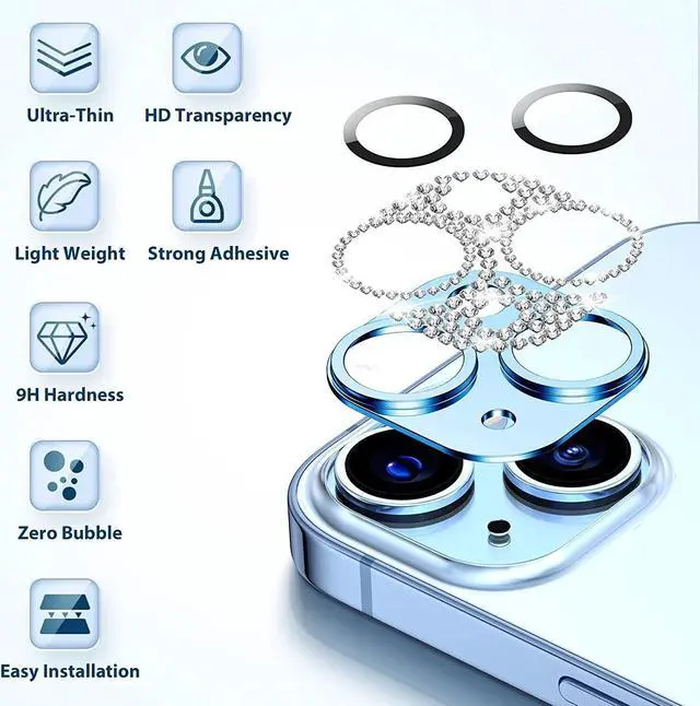 Features: Compatible with Apple iPhone 13 / iPhone 13 Mini. Shield your phone's rear camera lens with a full-coverage tempered glass protector. Take clean pictures and videos through super-clear glass with zero flash interference. Zinc alloy frame inlaid with reflective sparkly swarovski-grade rhinestones. Show off your style and individuality with rhinestone touch. The picture-perfect defense your state-of-the-art camera needs. Designed to fit flush with your lenses. Scratch proof surface with impact and shatter protection. The premium oleophobic coating keeps your lenses crystal-clean and free from oil, dirt, and fingerprints. Case-friendly design. Easy adhesive application.