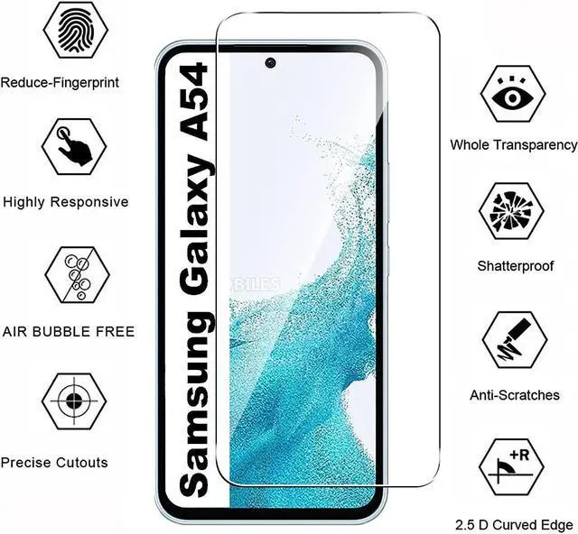 Features: Compatible with Samsung Galaxy A54 5G. Engineered to offer five times the strength of an unprotected screen. Advanced Impact Protection - Protect your smartphone with slim, high-quality Japanese tempered glass. Slim Design - The super-thin 0.33 mm glass preserves screen sensitivity to respond accurately to your touch. Feels Like Your Natural Screen - Your finger glides smoothly over the screen protector, just like it does over your device. Intelligent glass composition reacts like the natural screen. Advanced Defense Against Scratches - Rigorous testing proves a hardness rating of 9H - the highest level of scratch protection available. Anti-Fingerprint Coating - Engineered with fingerprint and oil resistance, you’ ll have a screen that’ s feeling clean and looking clear. Crystal-clear so you can see photos and videos as they’ re meant to be viewed. Self-adhesive application. Case friendly fit.