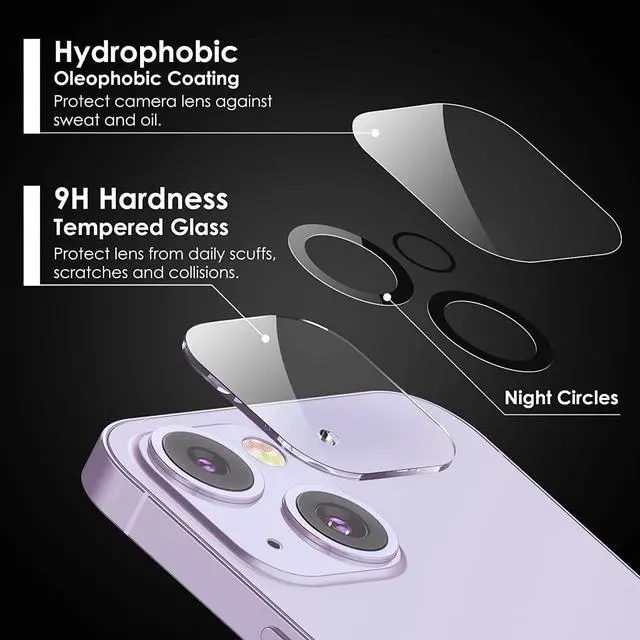 Features: Compatible with Apple iPhone 14 / iPhone 14 Plus. Shield your phone's rear camera lens with a full-coverage glass protector. 5-Layer coating enhances efficiency and durability without adding extra bulk. Easy-to-install via clear adhesive for maximum transparency. Take clean pictures and videos through super-clear glass with zero flash interference. Scratch proof surface. Superior lens protection. Anti-fingerprint coating. Case-friendly design.