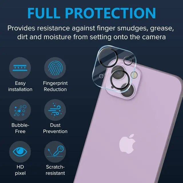 Features: Compatible with Apple iPhone 14 / iPhone 14 Plus. Shield your phone's rear camera lens with a full-coverage glass protector. 5-Layer coating enhances efficiency and durability without adding extra bulk. Easy-to-install via clear adhesive for maximum transparency. Take clean pictures and videos through super-clear glass with zero flash interference. Scratch proof surface. Superior lens protection. Anti-fingerprint coating. Case-friendly design.