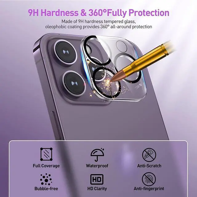 Features: Compatible with Apple iPhone 14 Pro / iPhone 14 Pro Max. Shield your phone's rear camera lens with a full-coverage glass protector. 5-Layer coating enhances efficiency and durability without adding extra bulk. Easy-to-install via clear adhesive for maximum transparency. Take clean pictures and videos through super-clear glass with zero flash interference. Scratch proof surface. Superior lens protection. Anti-fingerprint coating. Case-friendly design.