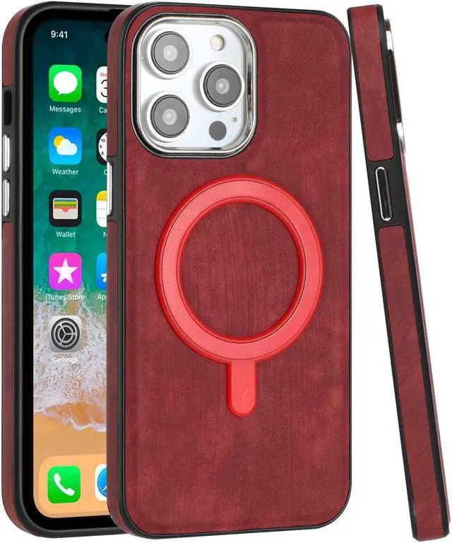 Features: Compatible with Apple iPhone 14 Pro. Designed to interact with Apple’ s MagSafe ecosystem. Compatible with Apple MagSafe chargers and accessories so you can power up without removing the case. Thanks to the case's design, your phone won't have added bulk all the way around, helping to keep your phone as slim and light as it was designed to be. The stylish leather finish not only feels great in hand, but it also provides excellent grip - reducing the risk of accidental drops and bumps. Premium TPU bumper material for durable flexibility. Front bumpers raised slightly above your screen act to protect your screen when placed face down or dropped. Raised camera cut-out with integrated camera lens bumper protector protects the lens from scratches when placing your phone on flat surface. Micro fiber inner lining. Embossed buttons for an easy, conspicuous press. Precisely cutouts to preserve full use of volume buttons, charger, camera, microphone, and all other ports.