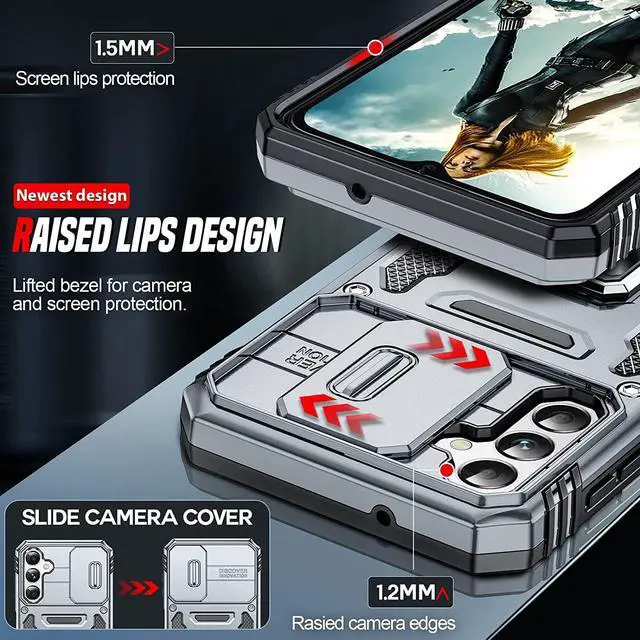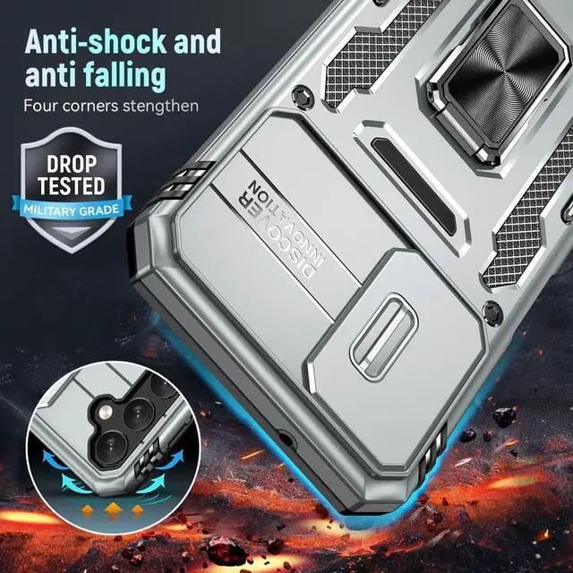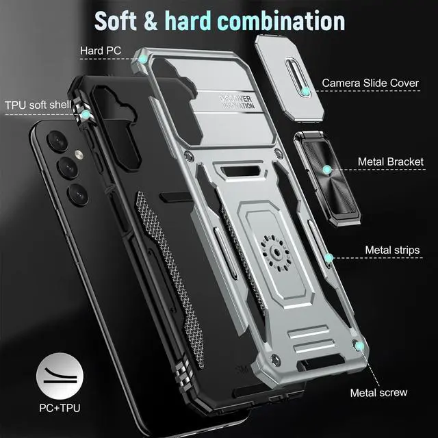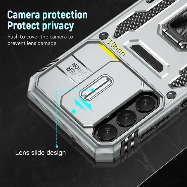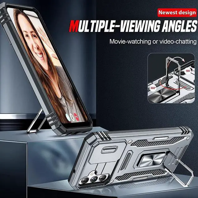 Features: Compatible with Samsung Galaxy S23 A14 5G. Military Standard Shock Test MIL-STD 810G- 516.6 Protection. The case endured 26 drops (at 48in) on all 6 faces, 12 edges and 8 corners of the device and sustained zero damage to the appearance and internal hardware of the phone itself. Made from a special strong and lightweight durable material, providing you with long lasting protection for your smartphone without making it cumbersome. The case features a handy finger loop that keeps your phone securely in hand while on your next adventure and even works as a viewing stand to watch movies. The ring grip folds flat and out of view if you do not want or need it. But if you do, simply pull the loop out, slip your finger through and you have an extra secure grip on your phone. Unique mix material hybrid design. This hard-wearing tough case safe-guards your phone against whatever life can throw your way, keeping your device secure at all times even in the most extreme of conditions. Raised front bezel and camera opening prevent scratches to the screen and camera lens.