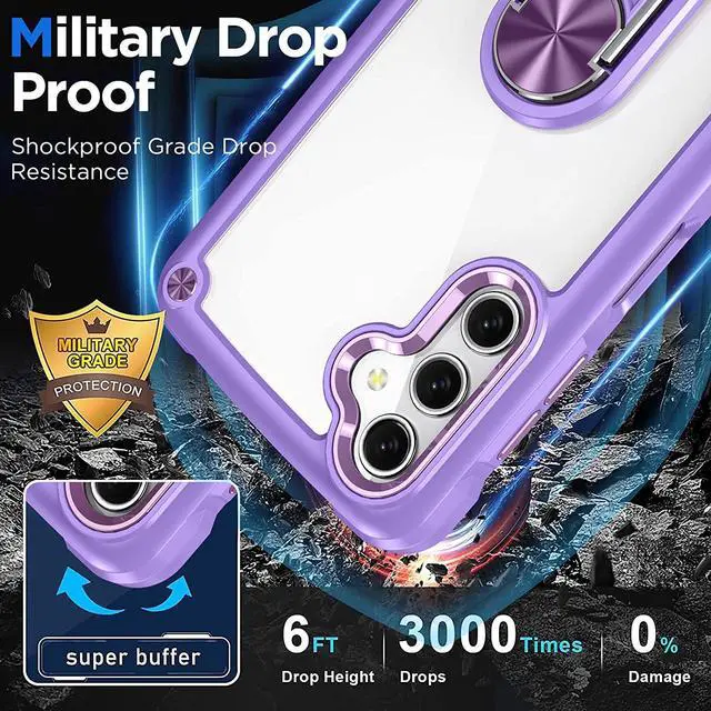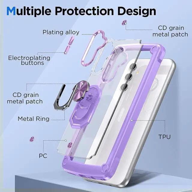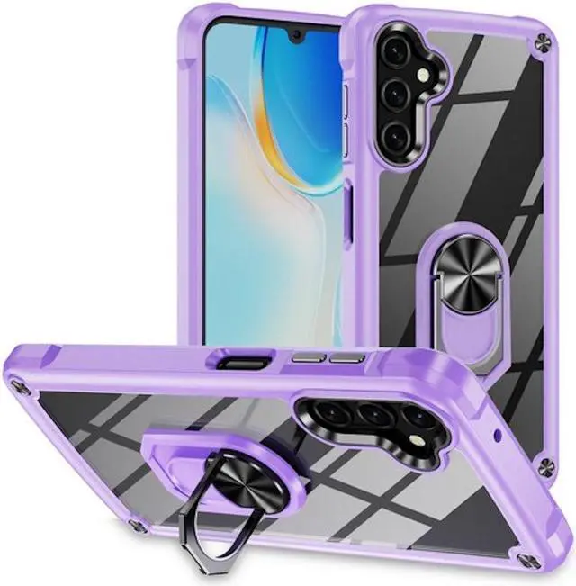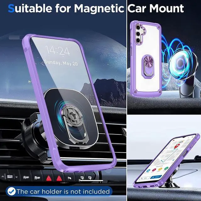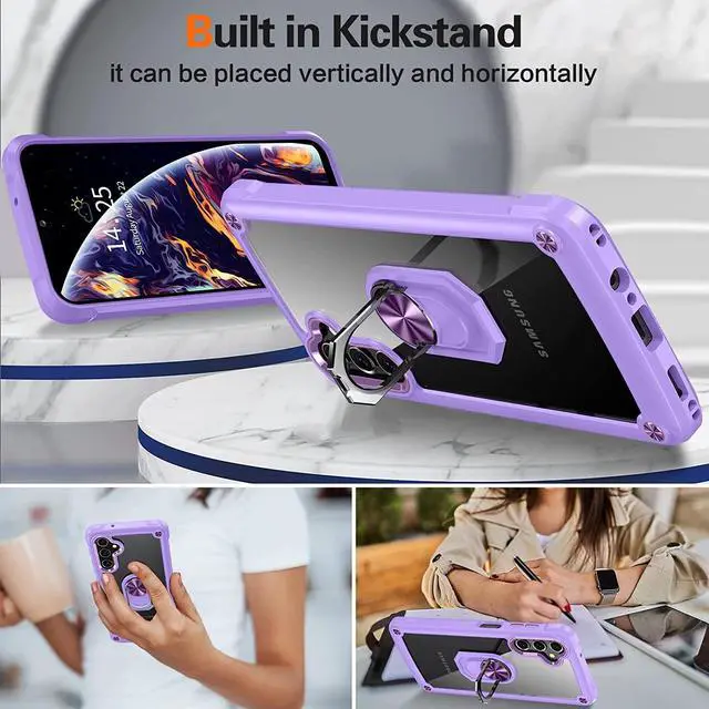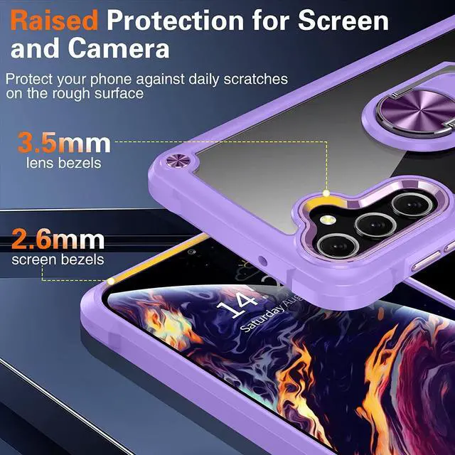 Features: Compatible with Samsung Galaxy A14 5G. Extensively drop tested, so you can feel reassured that your device is well protected. Crystal clear case provides a slim fitting stylish design and reinforced corner shock protection against damage, keeping your device looking great at all time. Made from reinforced bonded thermopolyurethane and optical grade polycarbonate materials, which makes it flexible enough to absorb punishment but hard enough to resist potential damage. The back of the case has a built-in extremely practical handle, Ring, which can be put on the finger to hold the phone more securely in your hand. Pull the ring out and have a handy viewing stand to comfortably watch your favorite show. Designed to be slim, lightweight and strong - so you can be assured that this case will add virtually no extra bulk to your phone and will still fit in your pocket with ease. Raised bezels on the case protects your phone's screen and camera from scratches. independent metal buttons for an easy, conspicuous press. Enjoy magnetic mount compatibility, as the ring holder also functions as a built-in metal plate.