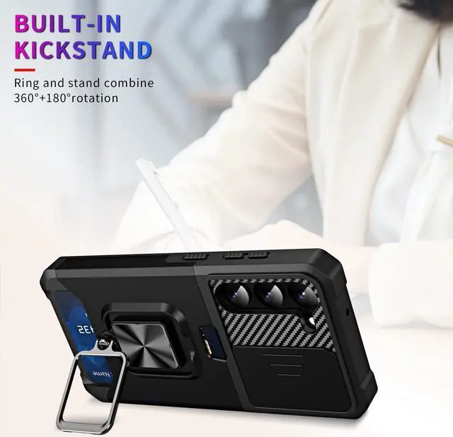Features: Compatible with Samsung Galaxy S23 Plus 5G. Military Standard Shock Test MIL-STD 810G- 516.6 Protection. The case endured 26 drops (at 48in) on all 6 faces, 12 edges and 8 corners of the device and sustained zero damage to the appearance and internal hardware of the phone itself. Stylish, minimalist protection for your smartphone. Crafted from anti-scratch TPU and a super strong polycarbonate frame, the case protects your device while complimenting its sleek aesthetics. Reinforced corners are designed to deflect shock force away from your phone and the corners are the most vulnerable areas of any phone or case. The back of the case has a built-in extremely practical handle, Ring, which can be put on the finger to hold the phone more securely in your hand. Flip the ring out and it doubles as a kickstand to take your binge-watching experience to the next level. With this case, you can leave your wallet at home thanks to the credit card slot featured on the case. Privacy camera cover slides left or right for total protection. Impact-absorbing TPU perimeter guards the device against bumps and drops.