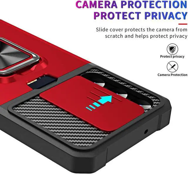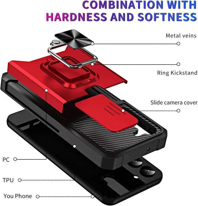 Features: Compatible with Samsung Galaxy S23 Plus 5G. Military Standard Shock Test MIL-STD 810G- 516.6 Protection. The case endured 26 drops (at 48in) on all 6 faces, 12 edges and 8 corners of the device and sustained zero damage to the appearance and internal hardware of the phone itself. Stylish, minimalist protection for your smartphone. Crafted from anti-scratch TPU and a super strong polycarbonate frame, the case protects your device while complimenting its sleek aesthetics. Reinforced corners are designed to deflect shock force away from your phone and the corners are the most vulnerable areas of any phone or case. The back of the case has a built-in extremely practical handle, Ring, which can be put on the finger to hold the phone more securely in your hand. Flip the ring out and it doubles as a kickstand to take your binge-watching experience to the next level. With this case, you can leave your wallet at home thanks to the credit card slot featured on the case. Privacy camera cover slides left or right for total protection. Impact-absorbing TPU perimeter guards the device against bumps and drops.