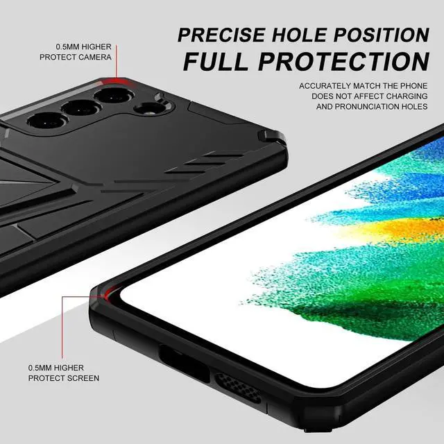 Features: Compatible with Samsung Galaxy S23 Plus 5G. Military Standard Shock Test MIL-STD 810G- 516.6 Protection. The case endured 26 drops (at 48in) on all 6 faces, 12 edges and 8 corners of the device and sustained zero damage to the appearance and internal hardware of the phone itself. Rugged composite case. Hybrid dual layered case protects from bumps, scrapes and drops. Reinforced corners are designed to deflect shock force away from your phone. Features an impact-resistant polycarbonate shell. Scratch resistant screen surround bezel. Made from a strong, durable lightweight material for long lasting protection. Textured fitting design adds no extra bulk and fits perfectly in your pocket. Located at the back of the case is a super-convenient flip-out kickstand. Folding completely flat when not in use, the kickstand can be called upon at will, allowing you to effortlessly watch media at any time and in any place. Enjoy magnetic mount compatibility, as the kickstand also functions as a built-in metal plate. Cut-outs for the main ports and features of the phone; use your device with ease.