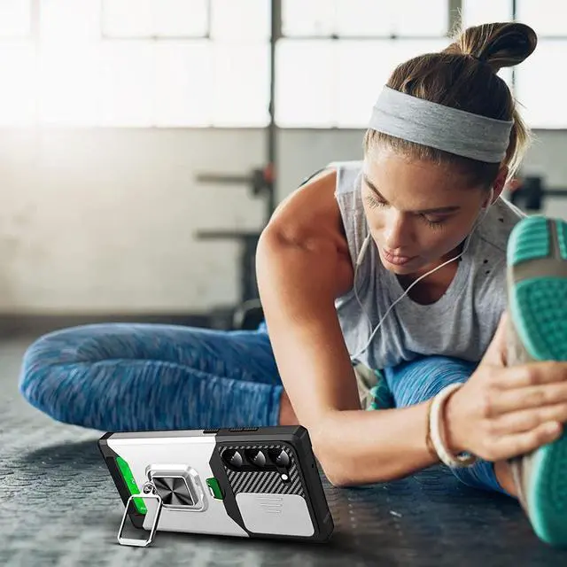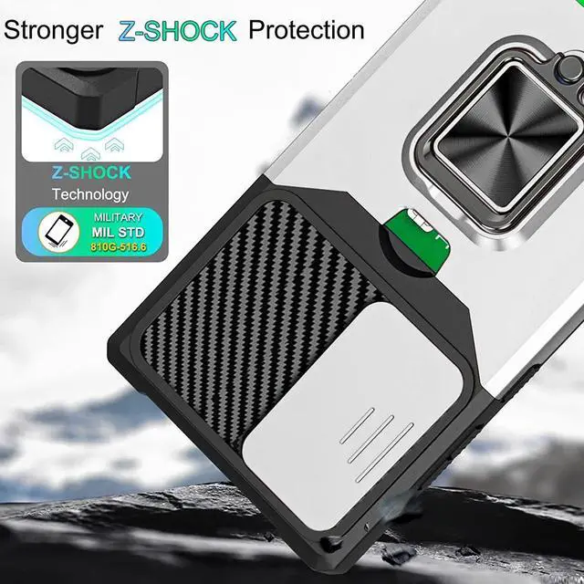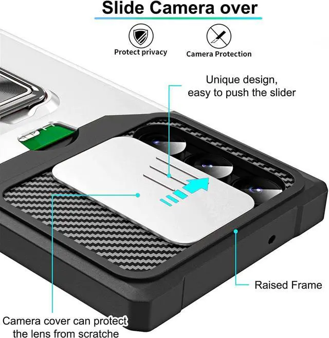 Features: Compatible with Samsung Galaxy S23 Plus 5G. Military Standard Shock Test MIL-STD 810G- 516.6 Protection. The case endured 26 drops (at 48in) on all 6 faces, 12 edges and 8 corners of the device and sustained zero damage to the appearance and internal hardware of the phone itself. Stylish, minimalist protection for your smartphone. Crafted from anti-scratch TPU and a super strong polycarbonate frame, the case protects your device while complimenting its sleek aesthetics. Reinforced corners are designed to deflect shock force away from your phone and the corners are the most vulnerable areas of any phone or case. The back of the case has a built-in extremely practical handle, Ring, which can be put on the finger to hold the phone more securely in your hand. Flip the ring out and it doubles as a kickstand to take your binge-watching experience to the next level. With this case, you can leave your wallet at home thanks to the credit card slot featured on the case. Privacy camera cover slides left or right for total protection. Impact-absorbing TPU perimeter guards the device against bumps and drops.