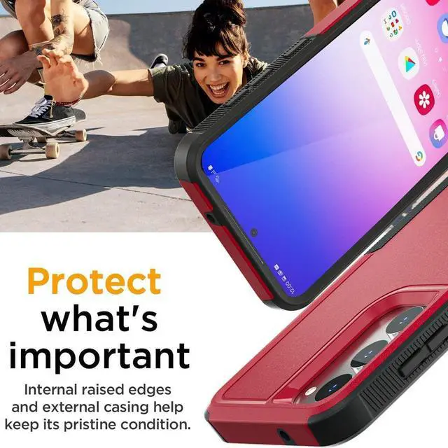 Features: Compatible with Samsung Galaxy S23 Plus 5G. Military Standard Shock Test MIL-STD 810G- 516.6 Protection. The case endured 26 drops (at 48in) on all 6 faces, 12 edges and 8 corners of the device and sustained zero damage to the appearance and internal hardware of the phone itself. Featuring a robust multi-layered design, the Tuff Case provides extreme protection for your device. This hard-wearing tough case safe-guards your phone against whatever life can throw at, keeping it secure at all times even in the most extreme of conditions. A soft rubberized TPU inner core tightly grips to your phone while absorbs shock and cushions the phone from drops and impact. Patented hybrid case with ridge polycarbonate hard shell for armor-like protection. Raised front bezel and camera opening prevent scratches to the screen and camera lens. Textured rubbery interior for impact resistant protection. Intuitive button covers for a tactile experience. Precise cutouts provide full access to your phone’ s important features, ports and buttons.